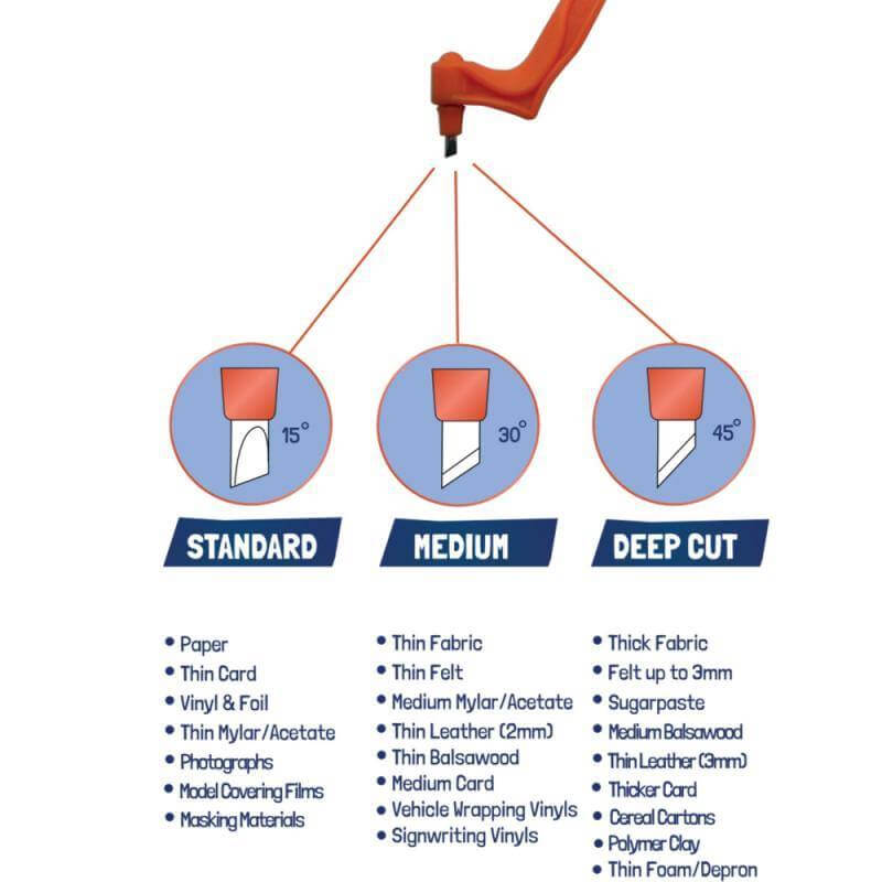 This product includes one 360-degree rotating craft tool equipped with three high-quality carbon steel blades (15 degrees, 30 degrees, 45 degrees). This tool is enabling you to cut very complex shapes easily and quickly. Unlike other craft cutters, the blade will not readily cut human skin in normal use, and it is very suitable for use in schools for younger craft and hobby enthusiasts.